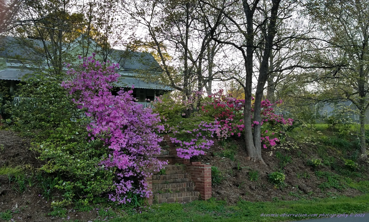 Azaleas are usually Springtime visitors. Some of them, well, they are the late bloomers. This is a small bush on the First Baptist church property. ~Vic